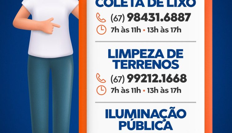 Para coleta de lixo: 67 98431- 6887. O atendimento é das 7h às 11h, e das 13h às 17h.