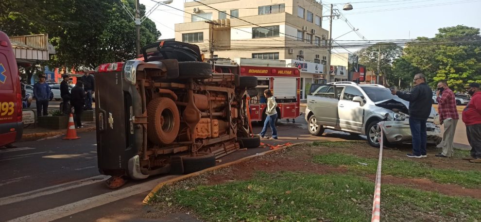 Com a batida, a S10 capotou.