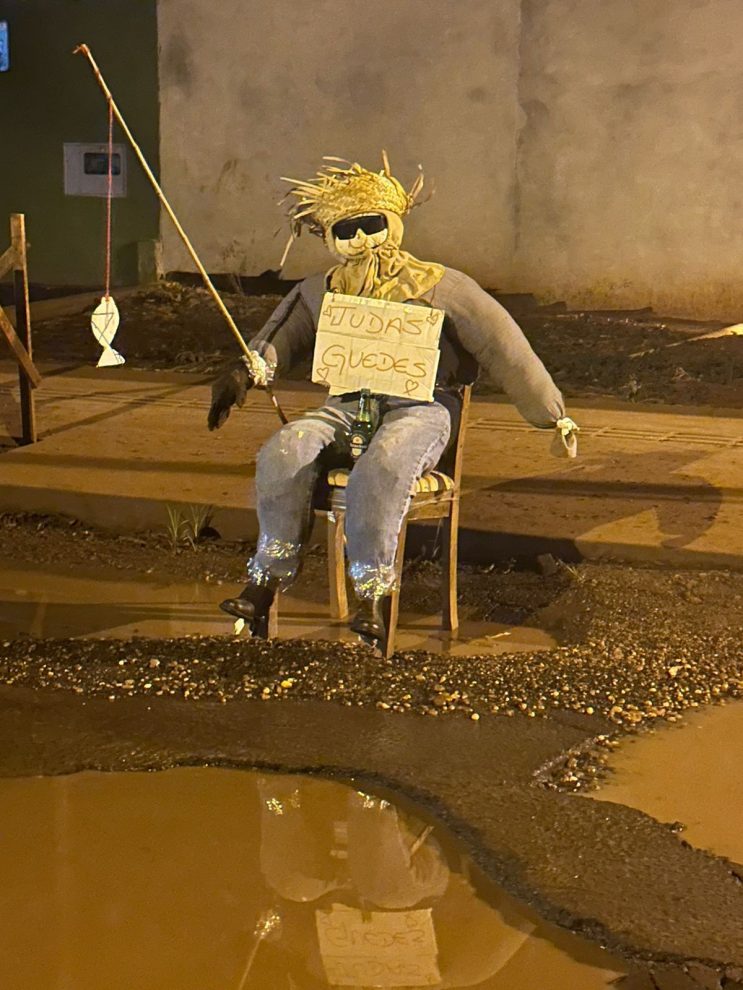Indignados, o grupo [de moradores] montou o boneco do ‘Judas’ com a placa ‘Judas Guedes’ e colocou no meio das crateras como forma protesto.