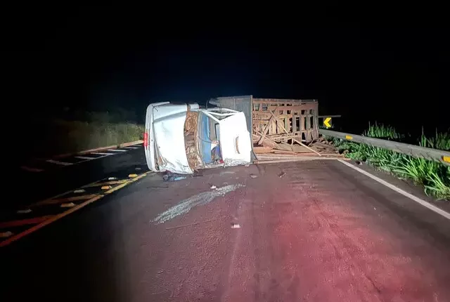 Na madrugada desta sexta-feira (27), caminhão carregado com eucalipto tombou na Serra de Maracaju, região de Nioaque, e dois homens foram socorridos em estado grave.