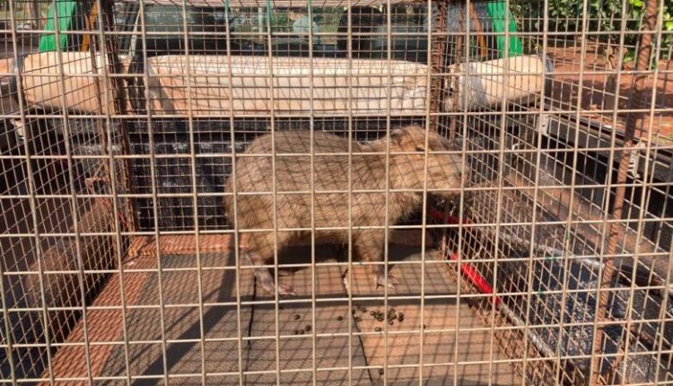 Os policiais foram ao local e verificaram a situação de risco à capivara e, dessa forma, a equipe utilizou cambões e puçás para capturar o animal e o colocou em uma jaula de contenção.