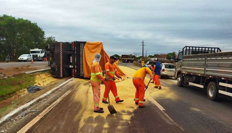 Na madrugada desta quinta (9), uma carreta tombou na BR-163, próximo ao túnel do Parque das Nações, em Dourados. O veículo estava carregado com 32 toneladas de farelo de soja.