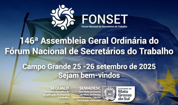 Campo Grande recebe quinta e sexta-feira (25 e 26) a 146ª Assembleia Geral Ordinária do Fórum Nacional de Secretarias de Trabalho (Fonset), reunindo representantes de todo o País para debater políticas públicas voltadas à geração de emprego, qualificação profissional e fortalecimento do Sistema Nacional de Emprego (Sine). O Fórum tem como objetivo promover o diálogo e fortalecer as políticas públicas trabalhistas nos estados.