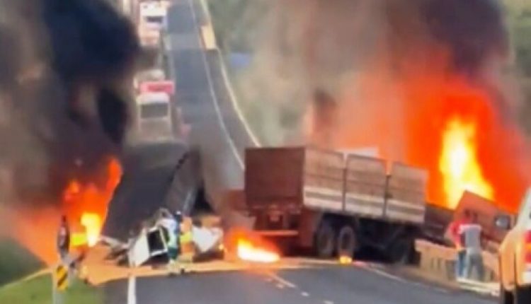 A PRF (Polícia Rodoviária Federal) informou que três carretas se envolveram no acidente, sendo que dois veículos colidiram frontalmente, e o terceiro saiu da pista.