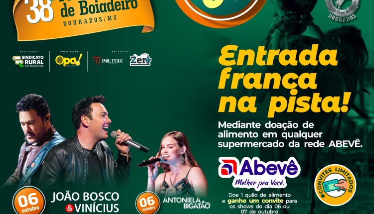 Os shows de João Bosco&Vinícius e Antoniela Bigatão são as atrações do dia 6 da 38ª Festa do Peão de Boiadeiro, que acontece no Parque de Exposições de Dourados. O evento fará parte da programação que prevê ainda a abertura oficial do rodeio, com competição nacional.