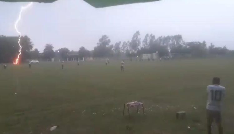 Raio cai em campo de futebol e assusta jogadores; veja o vídeo