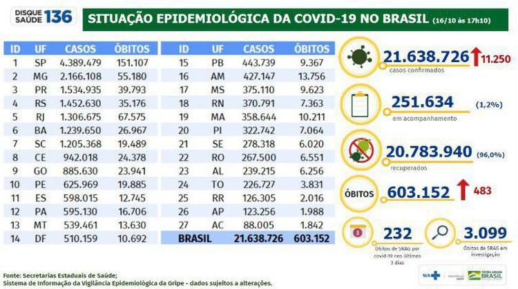 As mortes causadas pelo novo coronavírus ao longo da pandemia somam 603.152. Em 24 horas, as autoridades de saúde notificaram 483 novos óbitos.
