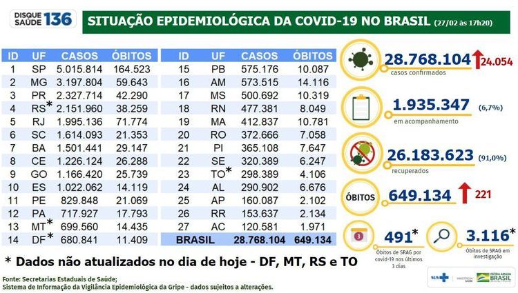 O Brasil chegou a 649.134 mortes em decorrência da covid-19, informou o Ministério da Saúde. Nas últimas 24 horas foram confirmados 221 óbitos e 24.054 diagnósticos positivos da doença, totalizando 28.768.104 pessoas infectadas pelo coronavírus desde o início da pandemia. Ontem (26), o painel de informações da pandemia administrado pelo ministério trazia 28.744.050 casos acumulados.