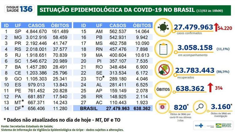O documento informa 314 mortes em 24 horas. Desde o início da pandemia, as mortes em decorrência da doença chegaram a 638.362. Existem 3.160 óbitos por síndrome respiratória aguda grave (SRAG) em investigação. Nesses casos, são necessários exames e procedimentos posteriores para determinar se a causa da morte foi covid-19.