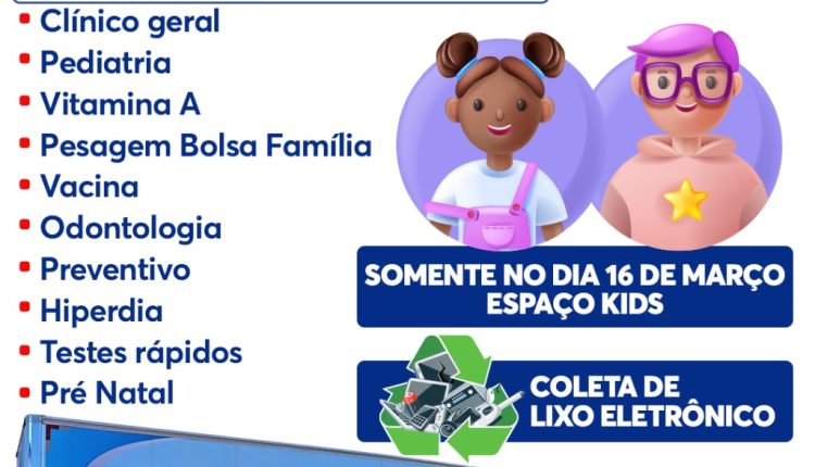 Durante esta semana serão oferecidos atendimentos como: Cardiologia e Oftamologia – para pacientes regulados – Clínico Geral, Pediatria, vitamina A, Pesagem da Bolsa, Vacina, Odontologia, Preventivo, hiperdia, testes rápidos e pré-natal.