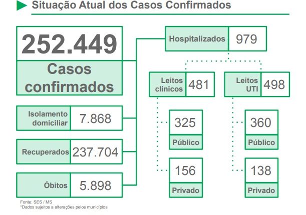 Com média móvel de 874,7 nos últimos sete dias, os cinco municípios que apresentaram maior incidência de novos positivos nas últimas 24 horas são os seguintes: Campo Grande + 285; Dourados +121; Três Lagoas + 113; Naviraí + 48 e Ponta Porã +44 novos casos.
