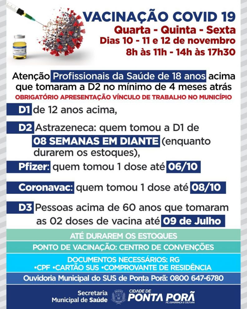 A vacinação contra a Covid-19 continua em Ponta Porã, nesta quarta-feira (10), com aplicação das doses 1, 2 e 3. A imunização acontece no Centro de Convenções, das 8h às 11h, e das 14h às 17h30.
