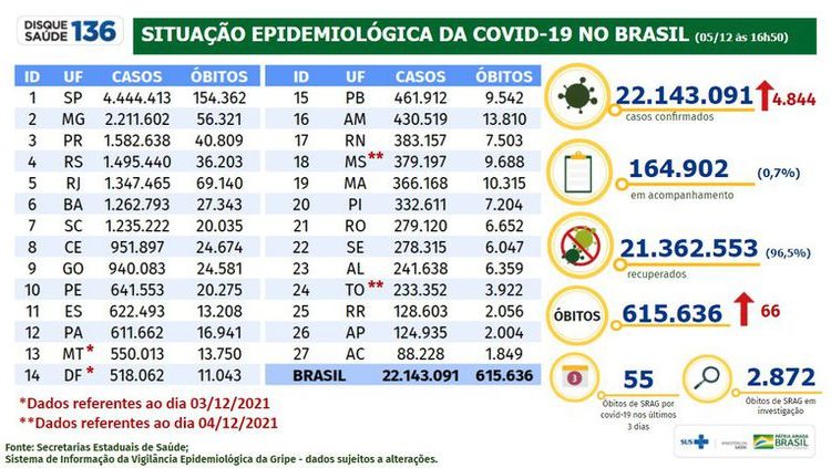 O balanço apontou ainda 164.902 pacientes em acompanhamento e 21.362.553 recuperados da doença.