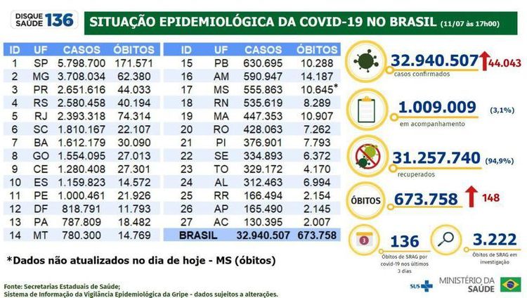 Com as novas informações, o total de pessoas infectadas pelo novo coronavírus durante a pandemia soma 32.940.507.