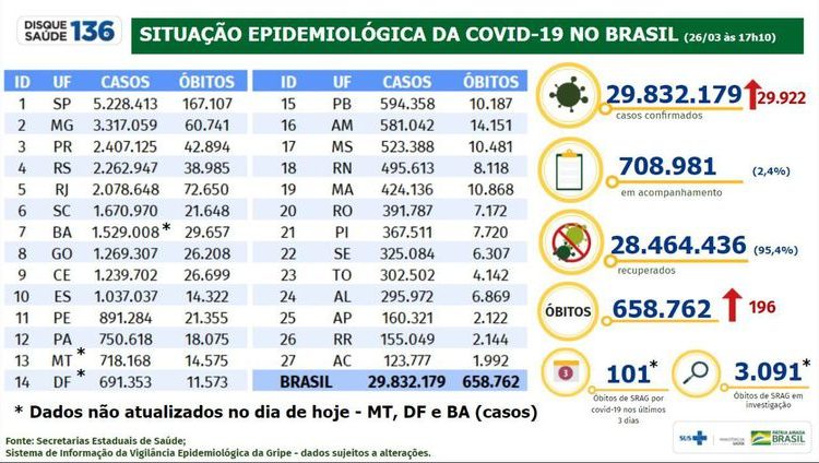Em 24 horas, foram registrados 29.922 casos da doença e 196 óbitos. Os dados não incluem atualizações do número de casos do Distrito Federal e dos estados do Mato Grosso e da Bahia.