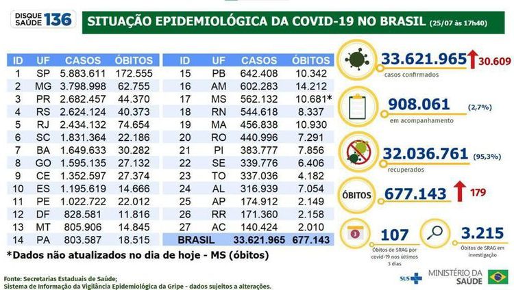 Desde o início da pandemia, o país acumula 33,6 milhões de casos confirmados e 677,1 mil mortes registradas. Os casos de recuperados somam 32 milhões (95,3% dos casos).