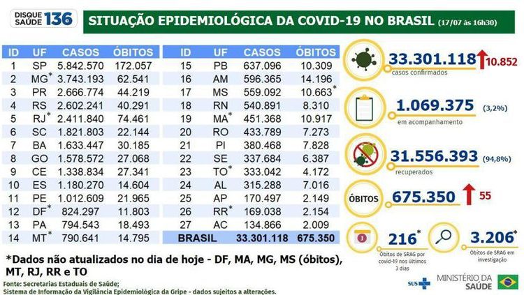 O país chegou a 675.350 mortes em decorrência da covid-19, informou o Ministério da Saúde. Segundo dados divulgados ontem (17), foram confirmados 55 óbitos e 10.852 diagnósticos positivos da doença, totalizando 33.301.118 pessoas infectadas pelo coronavírus desde o início da pandemia.