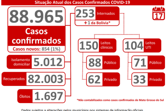 Com os números desta terça-feira, Mato Grosso do Sul passa a ter 88.965 casos confirmados de Covid-19 e 1.697 mortes. 82.003 pacientes estão recuperados.