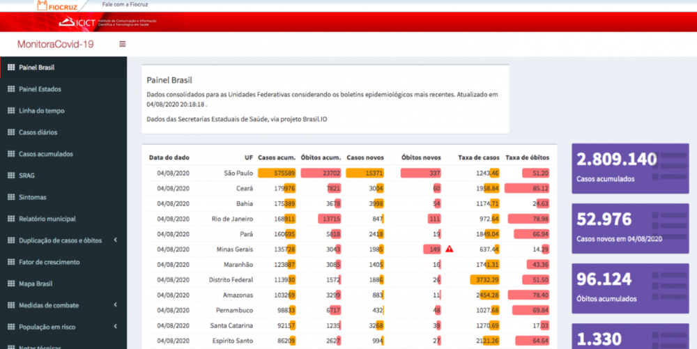 O projeto MonitoraCovid-19, desenvolvido por pesquisadores da Fundação Oswaldo Cruz (Fiocruz), foi tema do webinar do Fórum de Reportagem sobre a Crise Global de Saúde, realizado no dia 4 de agosto. Na ocasião, o geógrafo da saúde, Raphael Saldanha, e o desenvolvedor do projeto, Diego Xavier, falaram sobre a plataforma que reúne informações sobre a pandemia no Brasil e no exterior.
