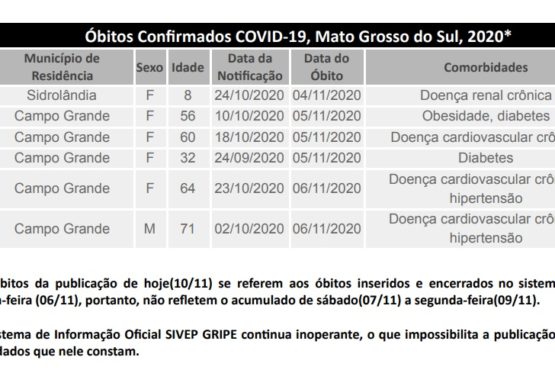 “Os óbitos da publicação de hoje (10/11), se referem aos óbitos inseridos e encerrados no sistema na sexta-feira (6/11), portanto, não refletem o acumulado de sábado (7/11), e a segunda-feira (9/11). O Sistema de Informação Oficial SIVEP GRIPE continua inoperante, o que impossibilita a publicação real dos dados que nele constam”.