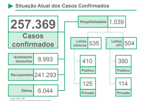 Com total de 257.369 casos, as cinco cidades com maior número de novos positivos registrados hoje são: Campo Grande +193; Dourados +92; Rio Brilhante +41; Corumbá +36 e Ponta Porã + 30.