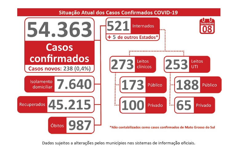 O número de casos confirmados pelo novo coronavírus vem apresentando ligeira queda em Mato Grosso do Sul. Nas últimas 24 horas foram 238 registros de casos positivos na base de dados da Secretaria de Estado de Saúde (SES) abastecida pelos municípios.