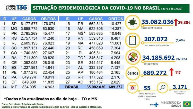 O total de casos confirmados do novo coronavírus no país agora soma 35.082.036. Os casos em acompanhamento chegam a 187.325. O termo é usado para designar casos notificados nos últimos 14 dias que não tiveram alta e nem resultaram em óbito. O número de óbitos causados pela doença atingiu 689.272 desde o início da pandemia. Ainda há 3.171 mortes em investigação.