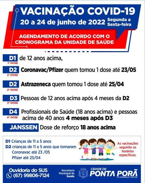 Ponta Porã aplica a partir desta segunda-feira (20), a quarta dose da vacina contra a Covid-19 para pessoas com 40 anos ou mais, que tenham tomado a D3 (Dose 3) há quatro meses.
