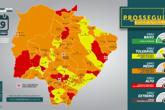 O Governo do Estado atualizou hoje (19), o mapa situacional do Prosseguir (Programa de Saúde e Segurança na Economia), e Ponta Porã se manteve na bandeira laranja, isto é, com grau médio de contágio pela Covid-19.