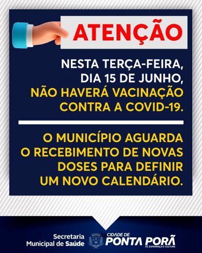 A prefeitura de Ponta Porã informou que nesta terça-feira (15), não haverá vacinação contra a Covid-19, isso porque o município depende do envio de novas doses.