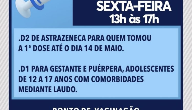 A partir das 13h desta sexta-feira (9), a Secretaria Municipal de Saúde aplica a primeira dose da vacina contra a Covid-19 em gestantes e puérperas, crianças e adolescentes entre 12 a 17 anos, com comorbidades.