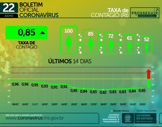 O boletim divulgado pela Secretaria Estadual de Saúde (SES) mostra que a taxa de contágio começou a sua queda em julho, com 0,96 no dia 09, caindo para 0, 92 no dia 14 de julho e a partir do dia 15 chegou a 0,85. O índice desceu para 0,82 em 18 de julho e na quinta-feira (22) voltou para 0,85.