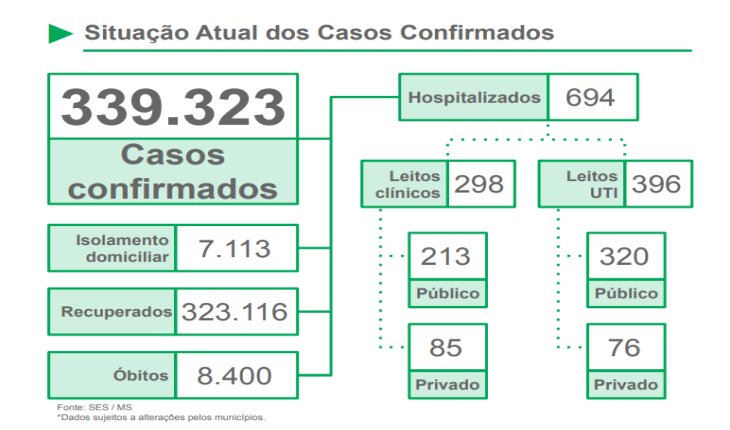 Conforme os dados do boletim epidemiológico desta terça-feira, dia 06, mais 678 novos casos de contaminação pelo coronavírus foram confirmados nas últimas 24 horas. Se somados, dede o início da pandemia, Mato Grosso do Sul já registrou 339.323.