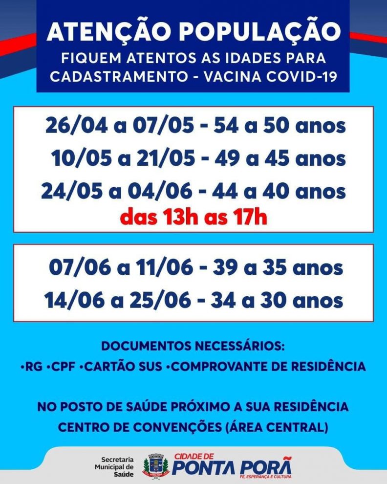 Em seguida, a faixa etária ‘cai’ para 45 a 49 anos, nos dias 10 a 21 de maio. Depois, 40 a 44 anos, entre 24 de maio a 4 de junho. O horário para vacinação é das 13h às 17h.