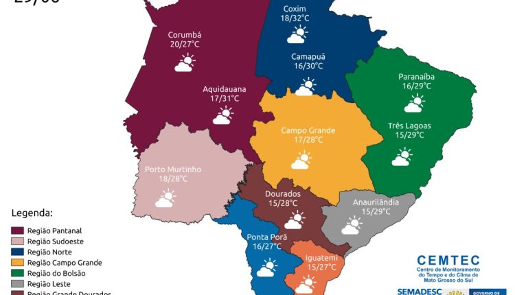 Na região pantaneira, mínima de 20°C e máxima de 27ºC em Corumbá, enquanto em Aquidauana a temperatura varia entre 17°C e 31°C. Na região sudoeste, Porto Murtinho amanhece com 18°C e atinge 28°C ao longo do dia. No norte, em Coxim, termômetros ficam entre 18°C e 32°C. No Bolsão, a temperatura em Três Lagoas será de 15°C na manhã e de 29°C no período mais quente.