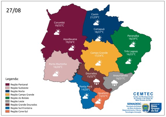 A previsão do Cemtec (Centro de Monitoramento do Tempo e do Clima) para este domingo (27/8), é de retorno do tempo estável, com sol e variação de nebulosidade em grande parte de Mato Grosso do Sul. Além disso, é previsto queda nas temperaturas em todo Estado, principalmente na região sul, com valores de mínimas entre 13°C e 15ºC.
