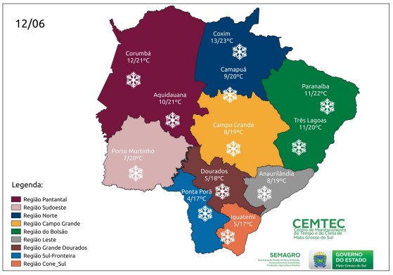 Para Campo Grande a mínima será de 8°C e máxima de 19°C. Já na região Norte, em Coxim, pode chegar a 23°C (máxima), com mínima de 13°C. Três Lagoas também terá máxima de 20° e mínima de 11°C. Já em Corumbá, na região do Pantanal, a temperatura vai variar entre 12°C (mínima) e 21°C (máxima).