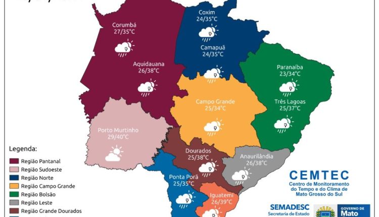 Pontualmente, podem acontecer chuvas mais intensas e tempestades acompanhadas de raios erajadas de vento, explica a coordenadora do Cemtec, a meteorologista Valesca Fernandes. “Essas instabilidades atmosféricas ocorrem devido ao intenso transporte de calor e umidade juntamente com a aproximação de uma frente fria”, comenta a profissional.Além disso, o aquecimento diurno, o deslocamento de cavados e a atuação de uma área de baixa pressão atmosférica favorecem a formação de nuvens e chuvas no Estado.São esperadas temperaturas 24°C e 38°C nas regiões sul, leste, pantaneira e norte. Para a região sudoeste, esperam-se altas temperaturas, com mínima de 27°C e máximas de até 40°C. Para a região do Bolsão, mínima de 23°C e máxima de até 37°C.Em Campo Grande, são esperadas temperaturas entre 25°C e 34°C. Já os ventos atuam do quadrante norte com velocidade entre 40 km/h e 60 km/h. Pontualmente, as rajadas podem ultrapassar esse valor.