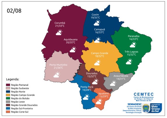No Pantanal, mínima de 21°C em Corumbá e máxima de 33°C; Aquidauana terá variação entre 20°C e 35°C. Na região sudoeste, Porto Murtinho amanhece com 21°C e atinge os 36°C ao longo do dia. No norte, Coxim terá mínima de 19°C e a máxima de 35°C. No Bolsão, Três Lagoas terá 15°C pela manhã e 32°C de tarde.
