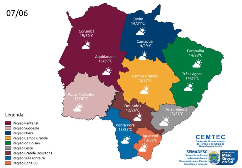 Em Campo Grande, a mínima será de 15°C e a máxima de 27°C. No sul-fronteira, em Ponta Porã, a mínima prevista é de 13°C e a máxima de 25°C; Iguatemi, no Conesul, começa o dia com 13°C e atinge a máxima de 26°C. As cidades do Bolsão terão mínima de 14°C também, e a máxima atinge os 29°C.