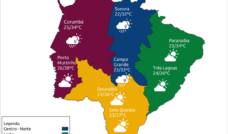 Outro destaque deste domingo são as elevadas temperaturas e os baixos índices de umidade do ar em algumas áreas do Estado. Enquanto as temperaturas podem chegar aos 39°C, especialmente nas regiões sudoeste e pantaneira, a umidade relativa do ar tende a atingir valores entre 20-40% nessas áreas.